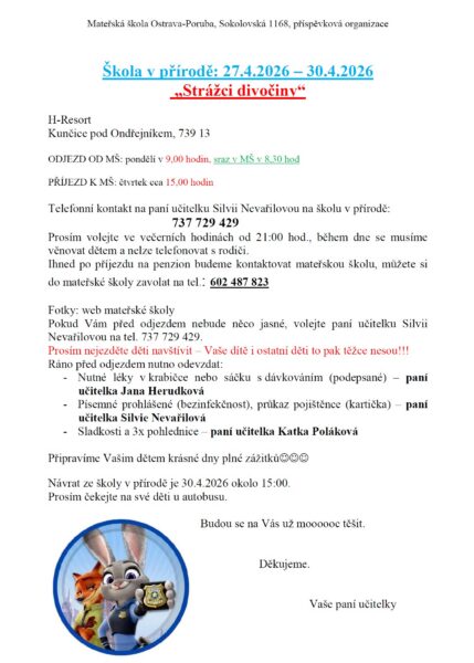 Děti musí být ve školce NEJPOZDĚJI v 7:00, svačinu budeme mít s sebou.
