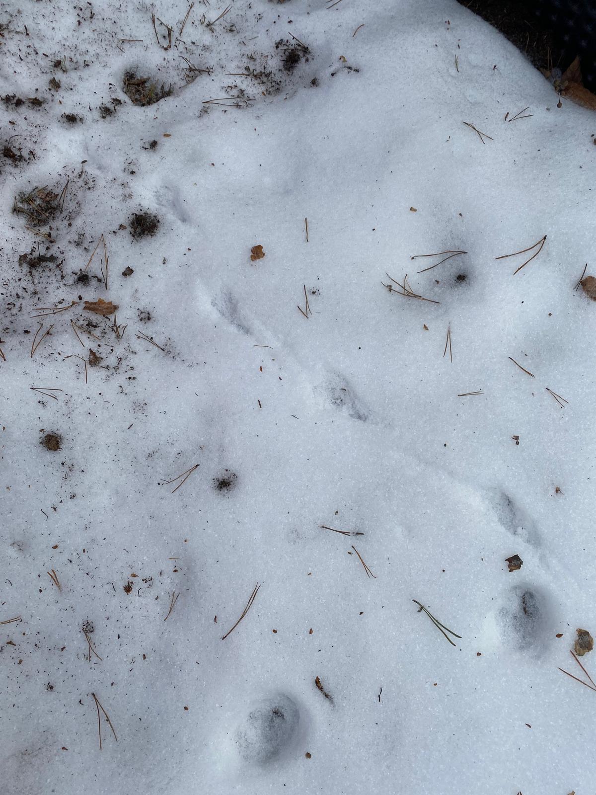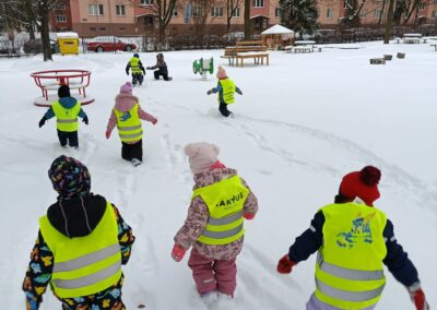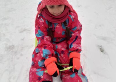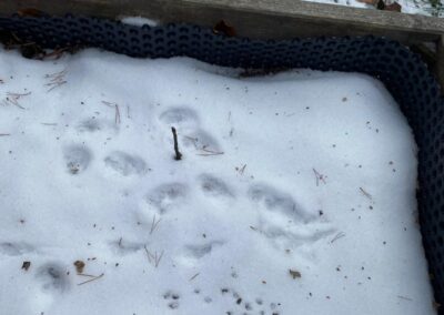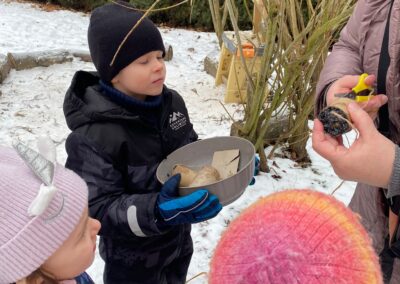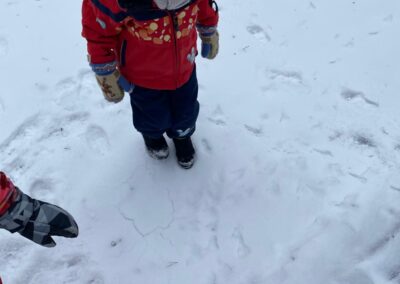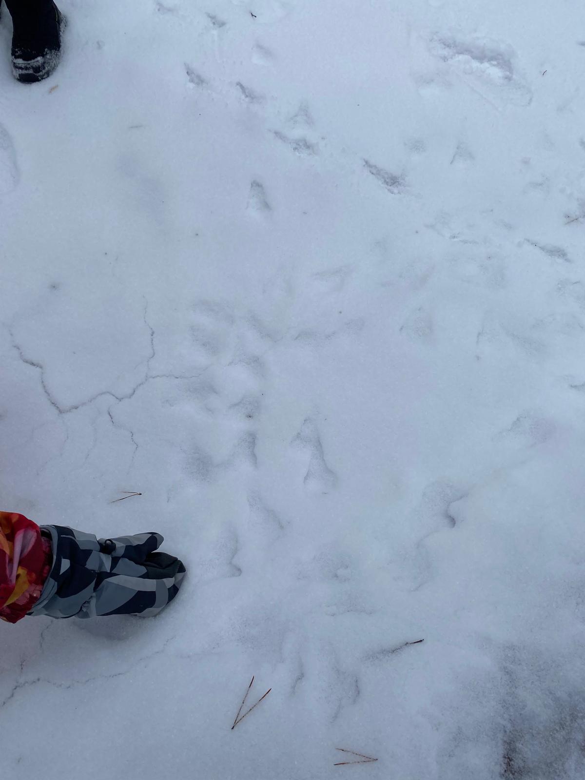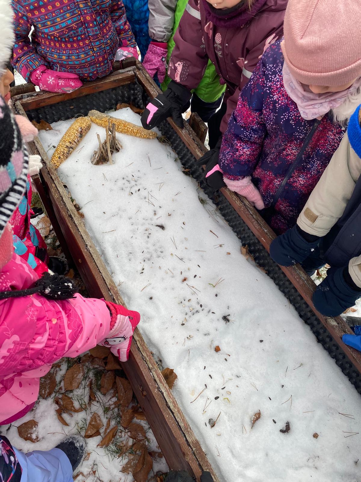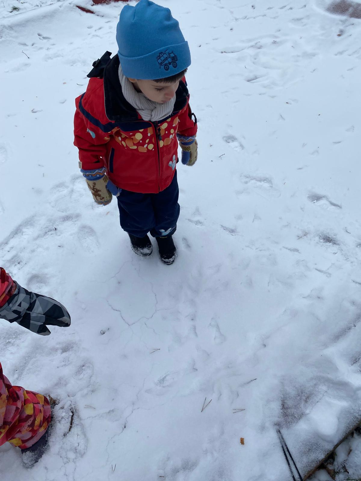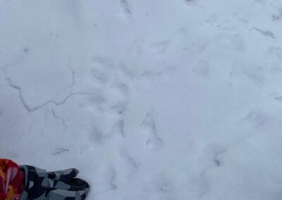 Sledování stop ptáků a zvířátek ve sněhu na školní zahradě. Poznali jsme stopy veverky, zajíce a havranů.