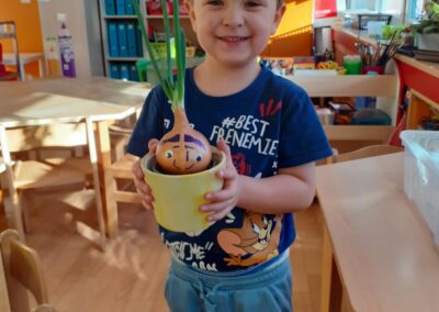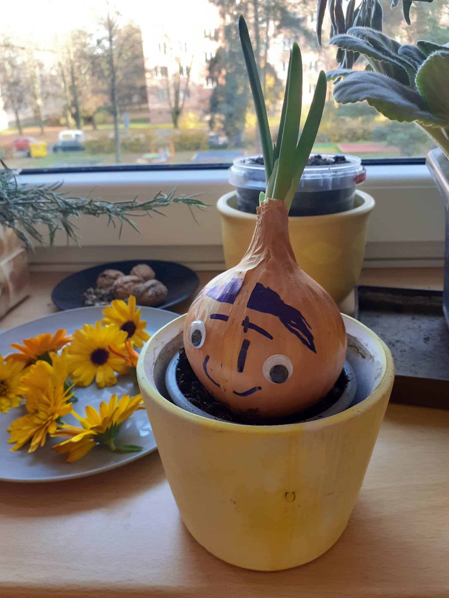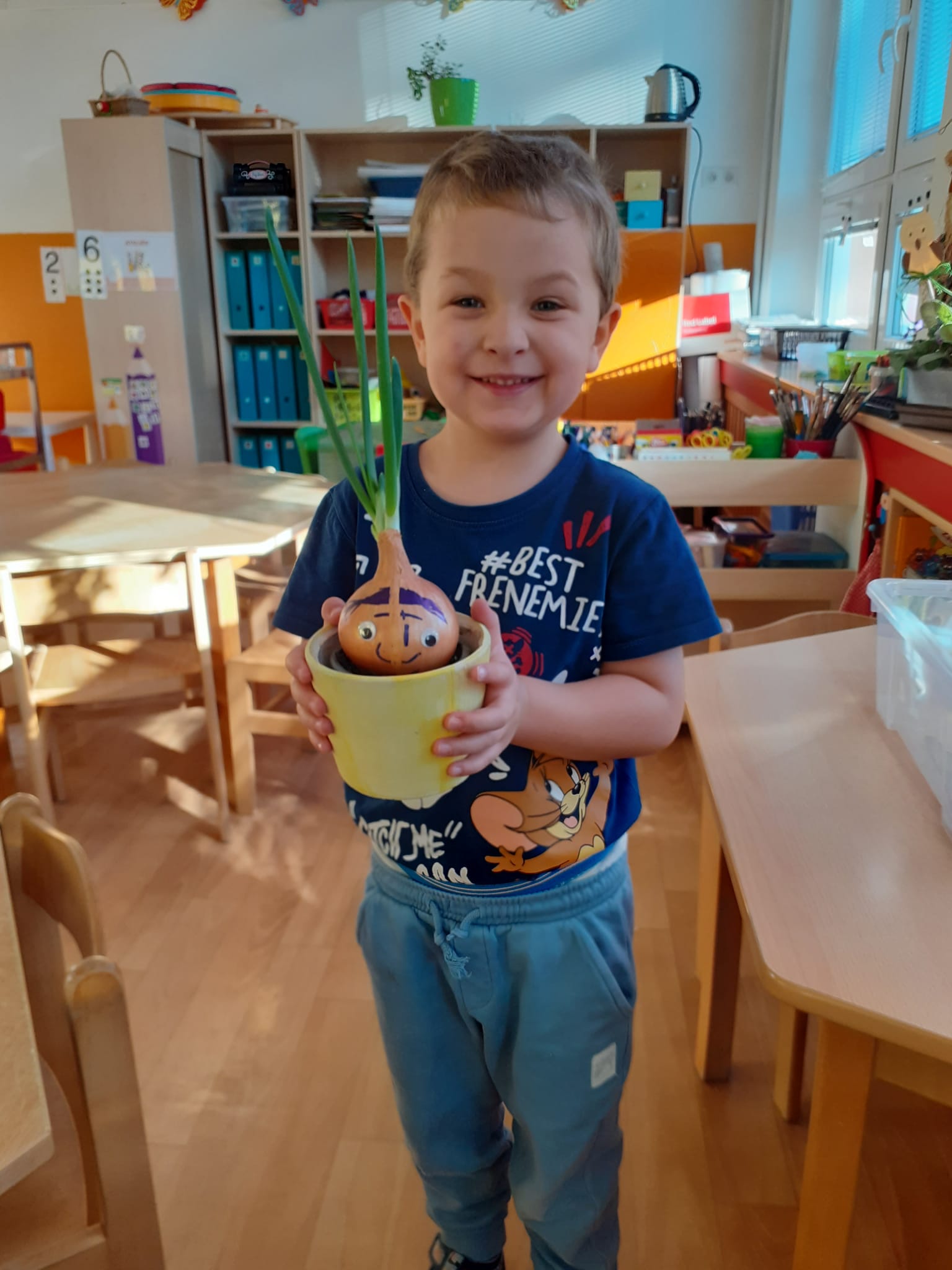 Vojta nám donesl vyzdobenou cibuli – „Cibuláčka“. Posadili jsme ho do květináče s hlínou a Cibuláčkovi vyrostly vlasy!!!